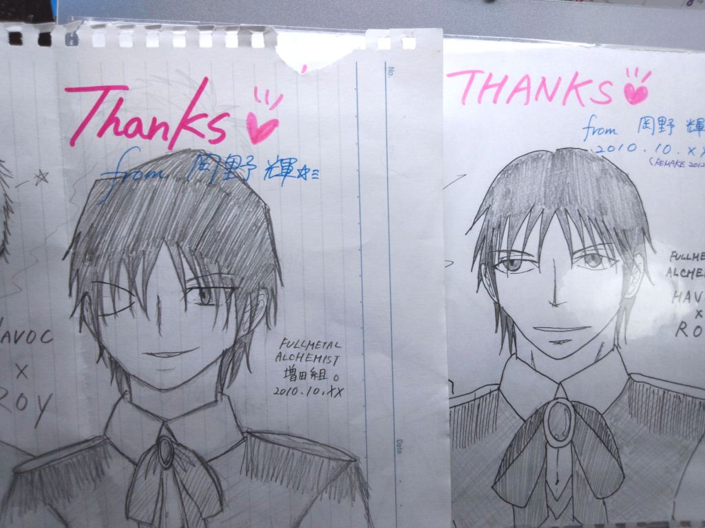 さっき500ヒット御礼イラストを発掘しまして、さきっぽが破れていたんでリメイクしたのですが、いやーほんとこのイラストが1.5年前!!恥ずかしい限りですね…バランス取れてないし、全然似てないし。つかハボ描きなれてなさすぎだし。比較も写メってみたよ。◆はぼ◆ますだ