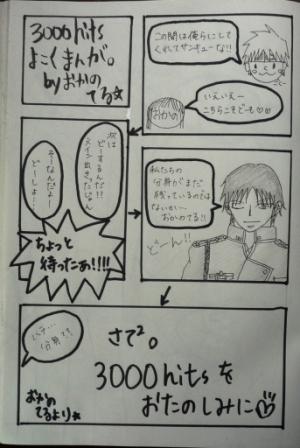最近ゲリラ豪雨ヤバいっすね~おかのです。さいゆー長編、いつになく長くなりそうです。ブルブラ級じゃないかなー。久々にがっつり頑張ってます。誤字脱字ありそうだな…そんなこんなでまたまた3000Hitsが近づいている模様。5000Hitsいったら1000刻みにしますが、それまでは頑張って500刻みでいきたいとおもいますよーてなわけで毎度おなじみな予告漫画もつけときました。あとでぴくしぶにもあっぷしときますー。